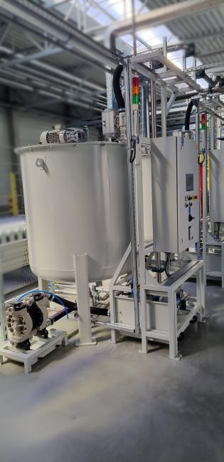 Zařízení bylo navrženo pro odběr různých druhů laků z IBC kontejnerů, jejich dopravu do mezizásobníků s automatickou kontrolou objemu média, promíchání a následné automatické přečerpávání do denních zásobníků podle aktuálních potřeb procesu.