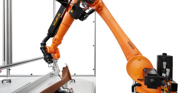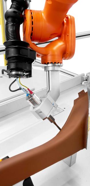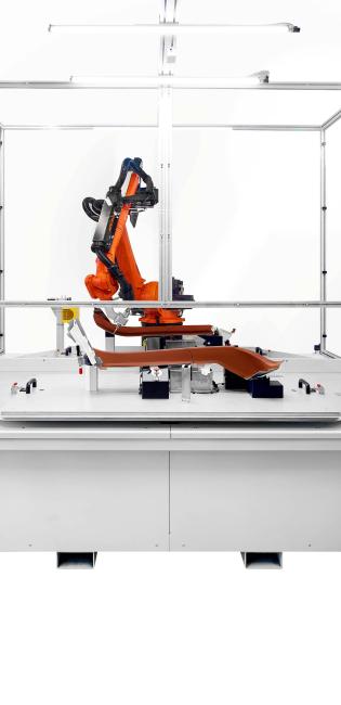 - Obrábění: Robot KUKA KR 8 R2010-2, vybavený ultrazvukovým nožem na úhlovém nástavci, přesně dosáhne ke všem hranám obrobku.