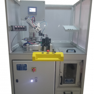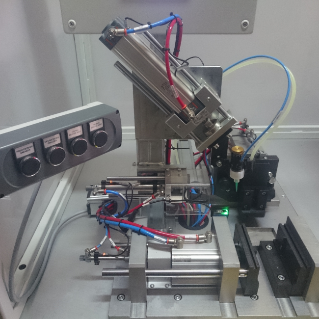 Stroj pro montáž ventilů na potrubí. Montáž s použitím lepidla. Přítomnost lepidla je kontrolována luminiscenčním senzorem. Správnost nanesení je potvrzena pomocí kamerového senzoru.