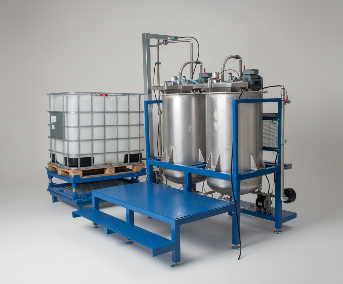 - Nádrže: Skladovací (1000-2000 l) a přípravné (300-500 l) s mechanickým míchadlem a mícháním pomocí recirkulace.