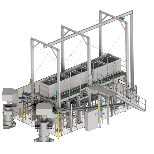 V případě, že zákazník nedisponuje jeřábem, můžeme instalaci vybavit vlastním systémem pro manipulaci a plnění z big bagů. Možné je také dávkování přímo z big bagů.